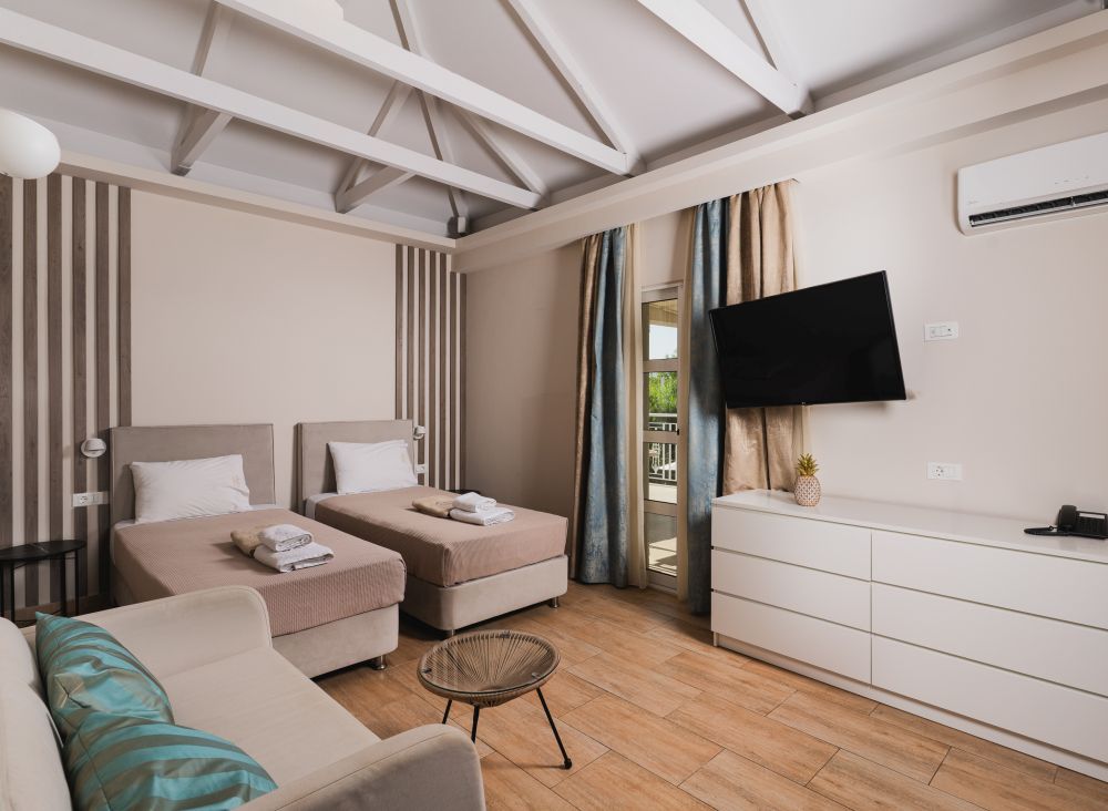Βρίσκεται στο ισόγειο για εύκολη και άνετη πρόσβαση. Οι απαλές αποχρώσεις δημιουργούν ένα ξεχωριστό σκηνικό, ενώ το δωμάτιο διαθέτει διπλό κρεβάτι, ντουλάπα, τηλεόραση επίπεδης οθόνης, μικρό ψυγείο και πλήρως επιπλωμένο μπαλκόνι. Αυτό το κατάλυμα μπορεί να φιλοξενήσει έως και 2 άτομα με βρεφική κούνια, η οποία προσφέρεται δωρεάν κατόπιν αιτήματος.